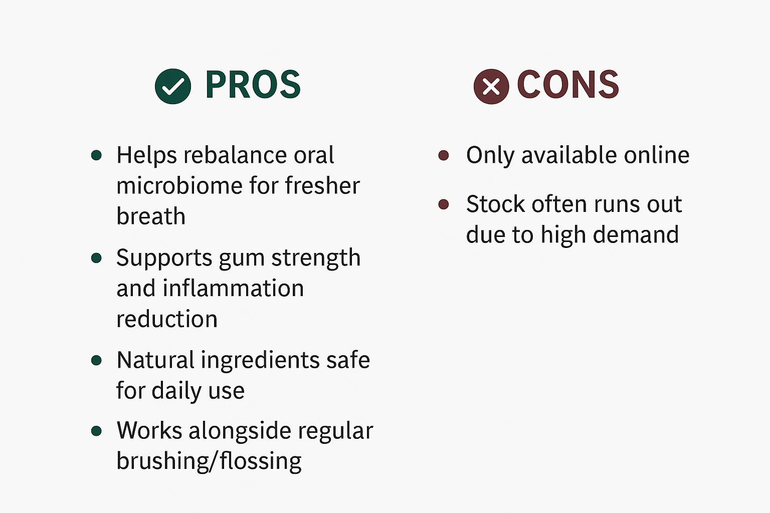 Ingredients help suppress harmful bacteria while promoting beneficial flora — similar to a probiotic effect, but focused on the mouth.